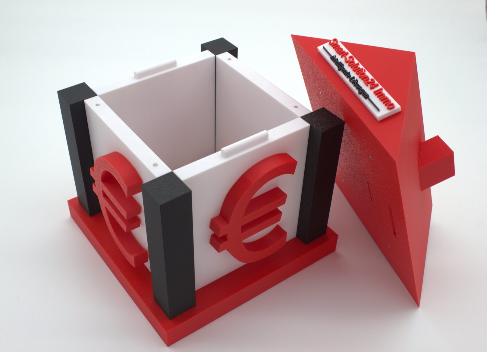 Diese Spardose wurde für das Unternehmen Smart-Solution24 Immo GmbH entworfen und ist ein 3D-Abbild des Firmenlogos. Sie dient als Werbegeschenk an den Kunden sowie der optischen Aufwertung des Empfangbereichs.